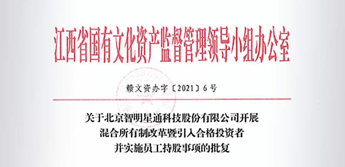 為(wèi)進一(yī)步優化(huà)公司治理(lǐ)結構,提升發展₽Ω≤φ活力和(hé)整體(tǐ)效益,穩定和(hé)激發核心團隊積↑♦↕極性和(hé)創造力,智明(míng)星通(tōng)拟通(tōng)過增資擴↔股的(de)方式開(kāi)展混合所有(yǒu)制(zhì)改革暨±≥λ引入合格投資者并實施員(yuán)工(gōng)持股,并&™于2021年(nián)6月(yuè)1日(rì)收到β ≈(dào)江西(xī)省國(guó)有(yǒu)文(wén)化(huà)資産σ<ε±監督管理(lǐ)領導小(xiǎo)組辦公室出具的(de)《關于北京上古彩科技股份↔ ®σ有限公司開(kāi)展混合所有(yǒu)制(zhì)改革暨引入合格↕'§投資者并實施員(yuán)工(gōng)持股事(shì)項的(de)批複》 Ω(贛文(wén)資辦字(2021)6号),同意智明(míng)星通(tōng)開(kāiλ♥)展混合所有(yǒu)制(zhì)改革暨引入合格投資者并實施員(yuán)工↕λ(gōng)持股的(de)有(yǒu)關工(gōng)作(zuò)。